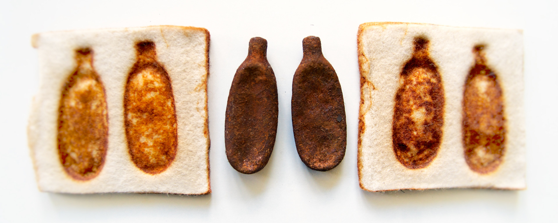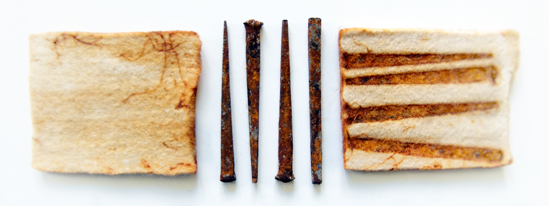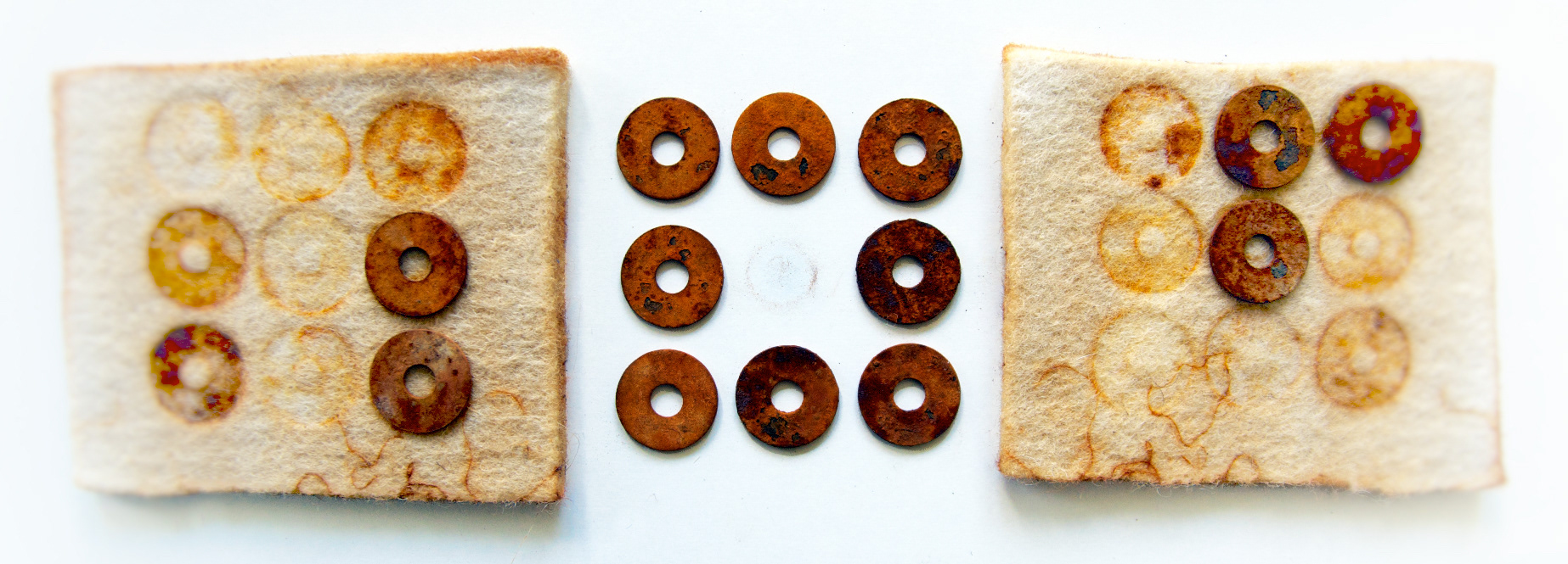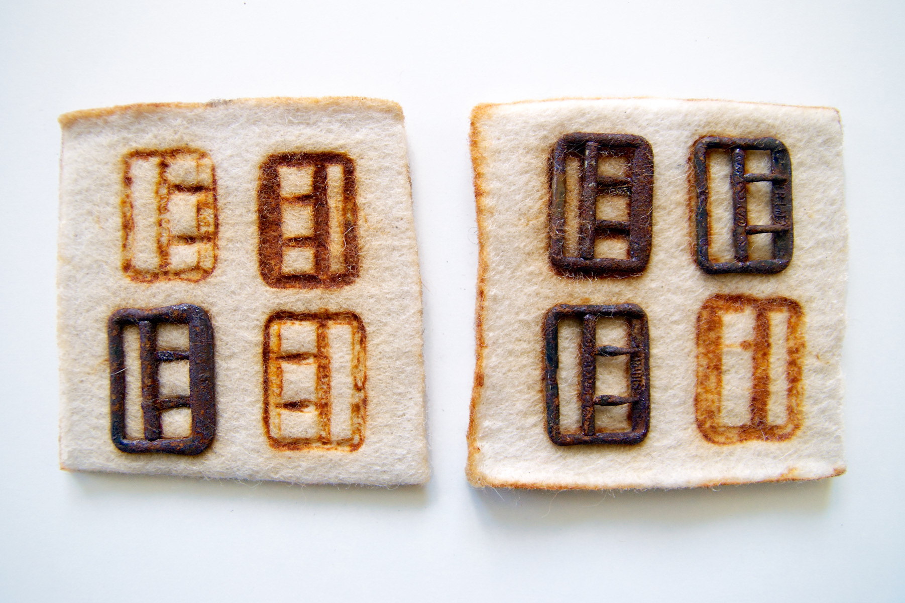 Experiments working with rust, found objects sandwiched between pure wool felt